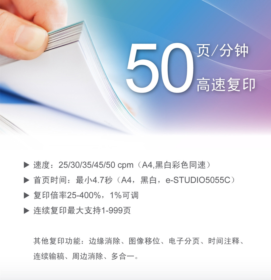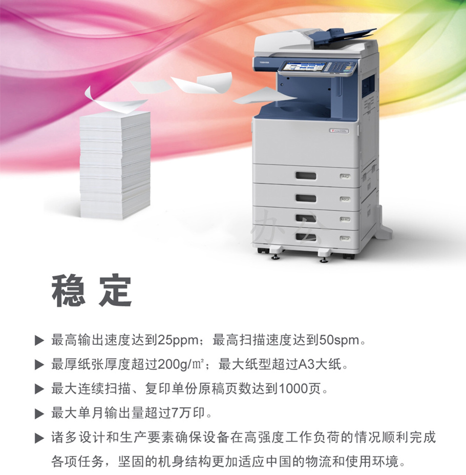描述:e-STUDIO2555C采用東芝新一代彩色數(shù)碼復(fù)合機(jī)系統(tǒng)平臺,搭載1.2GHz中央處理器及2GB系統(tǒng)內(nèi)存,配合東芝獨(dú)有的人性化操作界面,為客戶提供方便且高效穩(wěn)定的數(shù)據(jù)處理服務(wù)。