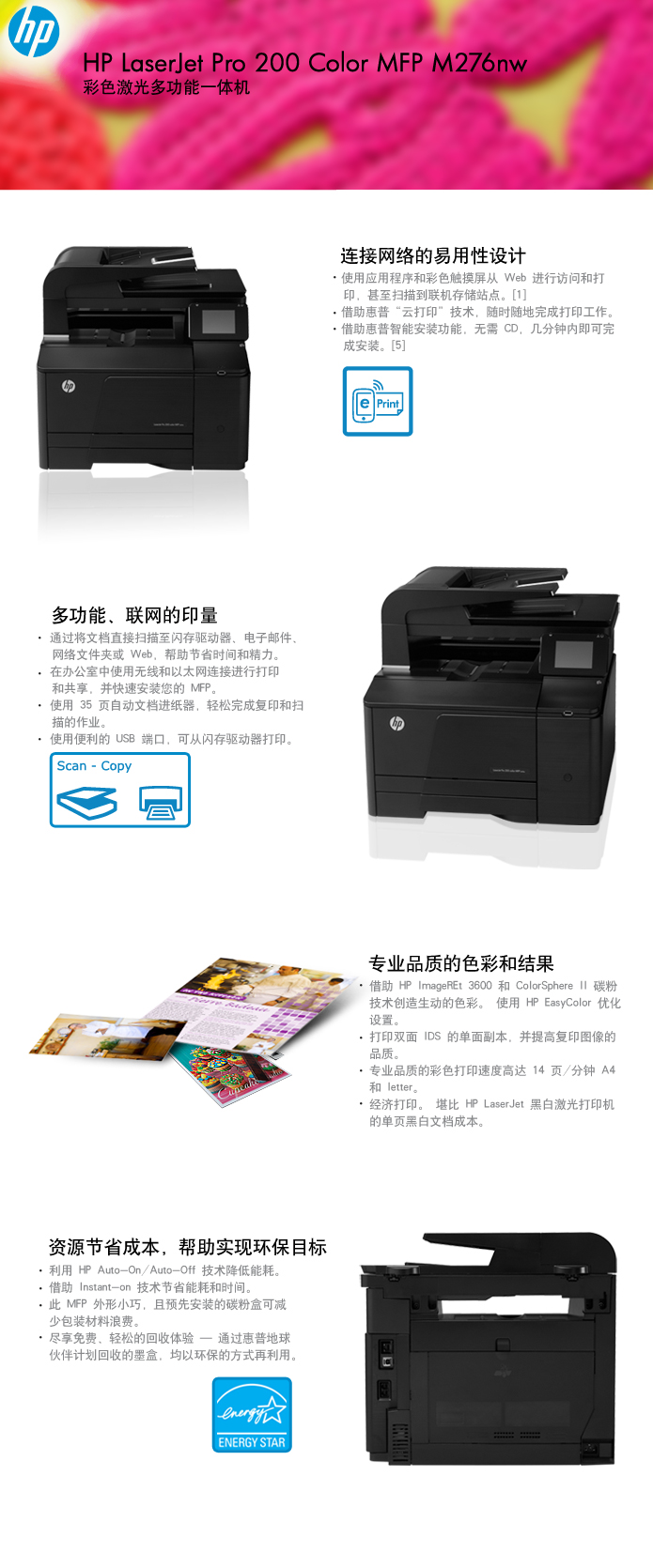 描述:惠普彩色打印/復(fù)印/掃描/傳真,四合一機(jī)型在啟用無(wú)線功能的彩色 MFP 上,使用觸摸屏訪問(wèn)業(yè)務(wù)應(yīng)用程序,可簡(jiǎn)化辦公任務(wù)。 采用HP云打印,可隨時(shí)隨地進(jìn)行打印。[3] 借助多功能的掃描、傳真和復(fù)印選項(xiàng)可提高印量。適用硒鼓:CF210A/CF210X/CF211A/CF212A/CF213A 黑/黑色大容量/青/黃/品紅打印硒鼓