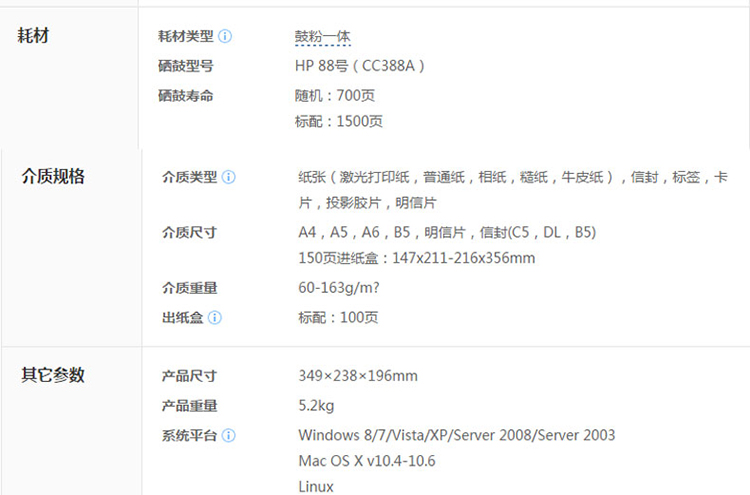 描述:紙張(激光打印紙,普通紙,相紙,糙紙,牛皮紙),信封,標(biāo)簽,卡片,投影膠片,明信片/介質(zhì)尺寸 A4,A5,A6,B5,明信片,信封(C5,DL,B5) 150頁(yè)進(jìn)紙盒:147×211-216×356mm