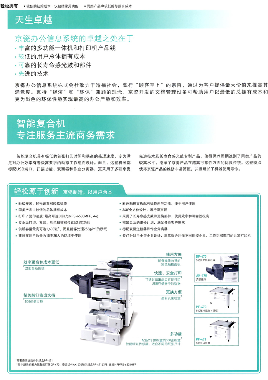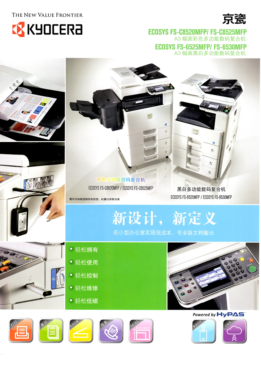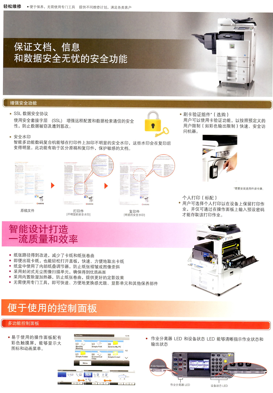 描述:4.3英寸彩色觸摸式面板,便捷的操作性、人性化設(shè)計的用戶使用界面/卡紙率低,卡紙排除便利/京瓷獨創(chuàng)的長壽命、高品質(zhì)非晶硅感光鼓/維修服務(wù)便利/可選購傳真組件/25頁/分鐘,打印速度快