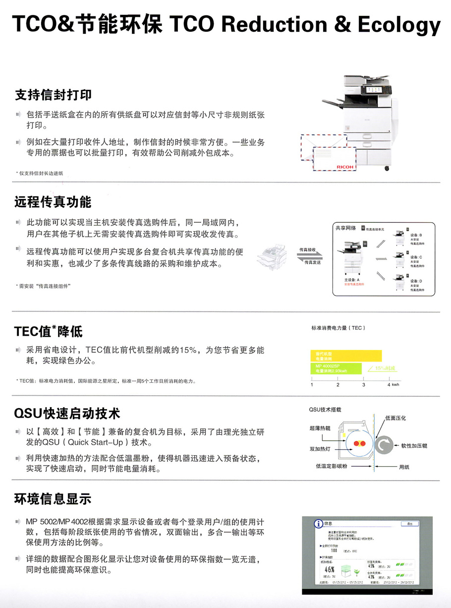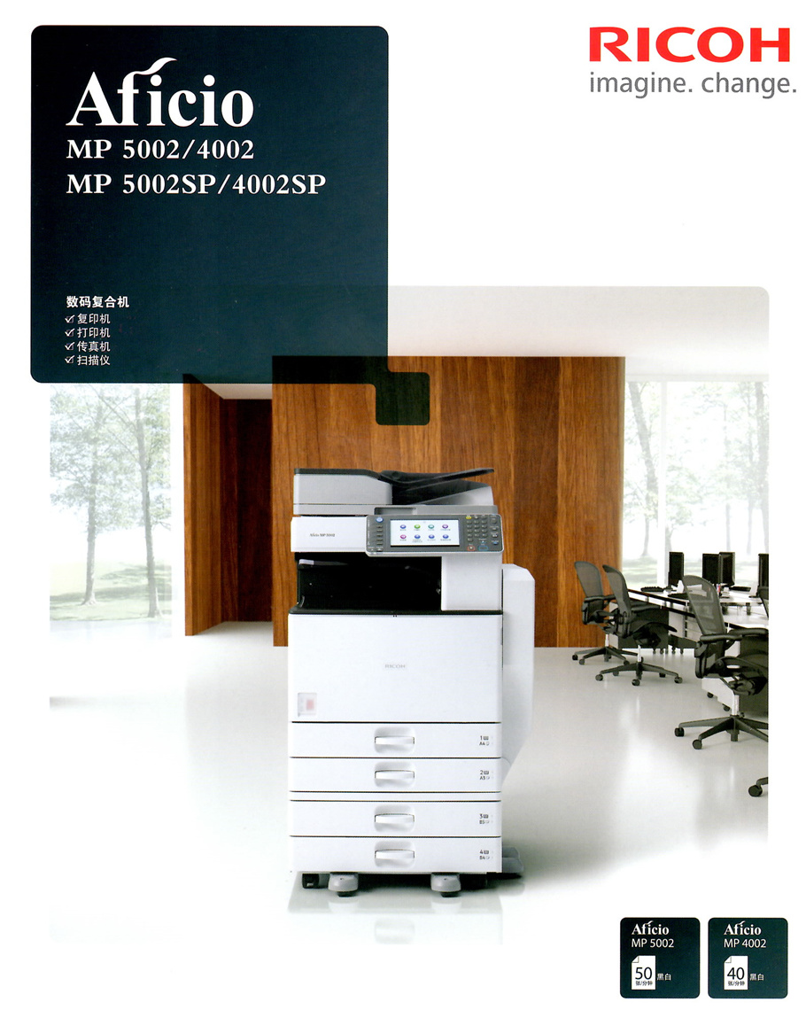 描述:炫睿系列Aficio MP 5002采用了全新開發(fā)的引擎控制器,將出眾的性能,革新的操作概念,嚴(yán)密的信息安全和綠色環(huán)保有機(jī)融合為一體。/理光第七代升級(jí)產(chǎn)品,理光代理商直接供貨。