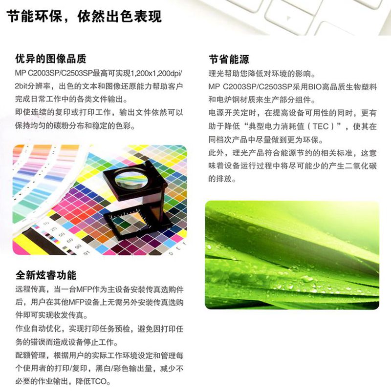 描述:最新款上市機型,比老款C2051處理速度提高,卡紙率降低,是一款同級別機型中佼佼者!理光MP C2003SP商務彩色多功能數(shù)碼復合機,集彩色復印、網絡打印、多樣掃描、無紙傳真及存儲發(fā)送等多種功能于一體,以高效的生產力,高品質的全彩圖象和人性化的功能設計滿足辦公用戶各種紛繁復雜的工作需求,是彩色辦公的新一代理想之選.