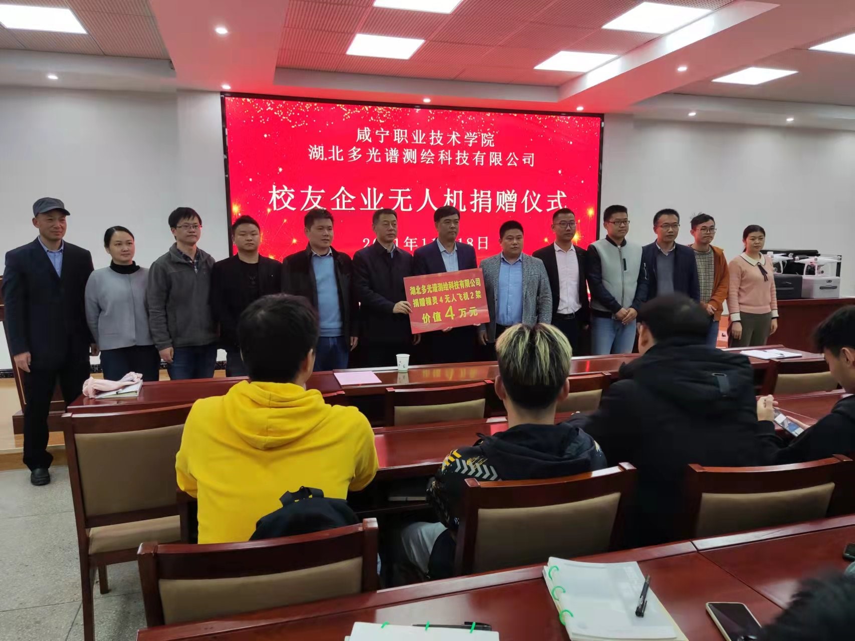 11月18日下午,湖北多光譜測(cè)繪科技有限公司與咸寧職業(yè)技術(shù)學(xué)院愛(ài)心無(wú)人機(jī)捐儀式在建筑樓210報(bào)告廳舉行。湖北多光譜測(cè)繪科技有限公司總經(jīng)理謝兵濤、副總經(jīng)理李詩(shī)評(píng)、趙波、方小焱、校友辦主任胡立軍、建筑學(xué)院院長(zhǎng)曾學(xué)禮、副院長(zhǎng)汪耀武、建筑學(xué)院校企合作負(fù)責(zé)人杜婧、建筑學(xué)院教師代表及學(xué)生代表參加捐贈(zèng)儀式,儀式由建筑學(xué)院院長(zhǎng)曾學(xué)禮主持。
